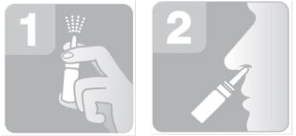 При применении нажать один раз (рис. 2). Препарат вдыхать через нос. По возможности держать флакон-распылитель вертикально. Не распылять горизонтально или вниз. После употребления флакон закрыть колпачком.